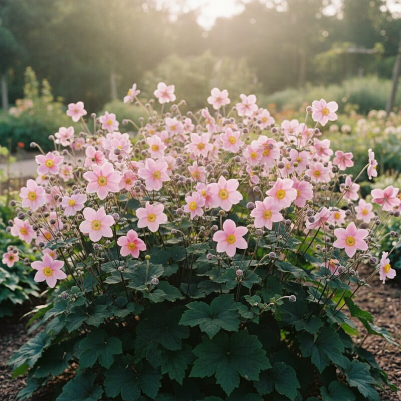 Zawilec japoński ‘Serenade’ to roślina, która wprowadza do ogrodu miękki, romantyczny nastrój wtedy, gdy lato powoli przechodzi w jesień. Na smukłych łodygach pojawiają się różowe kwiaty z żółtym środkiem, lekkie jak papierowe płatki, które kołyszą się przy każdym podmuchu wiatru. Dzięki temu rabata wygląda żywo i naturalnie, jakby kwiaty same „tańczyły” między innymi roślinami. ‘Serenade’ tworzy kępę liści i z czasem potrafi zrobić większą plamę, więc świetnie sprawdza się w półcieniu, pod koronami drzew i na spokojnych, zielonych tle. To idealny wybór, jeśli chcesz koloru późnym latem i jesienią oraz rośliny, która daje lekkość bez chaosu i jest wdzięczna w uprawie.