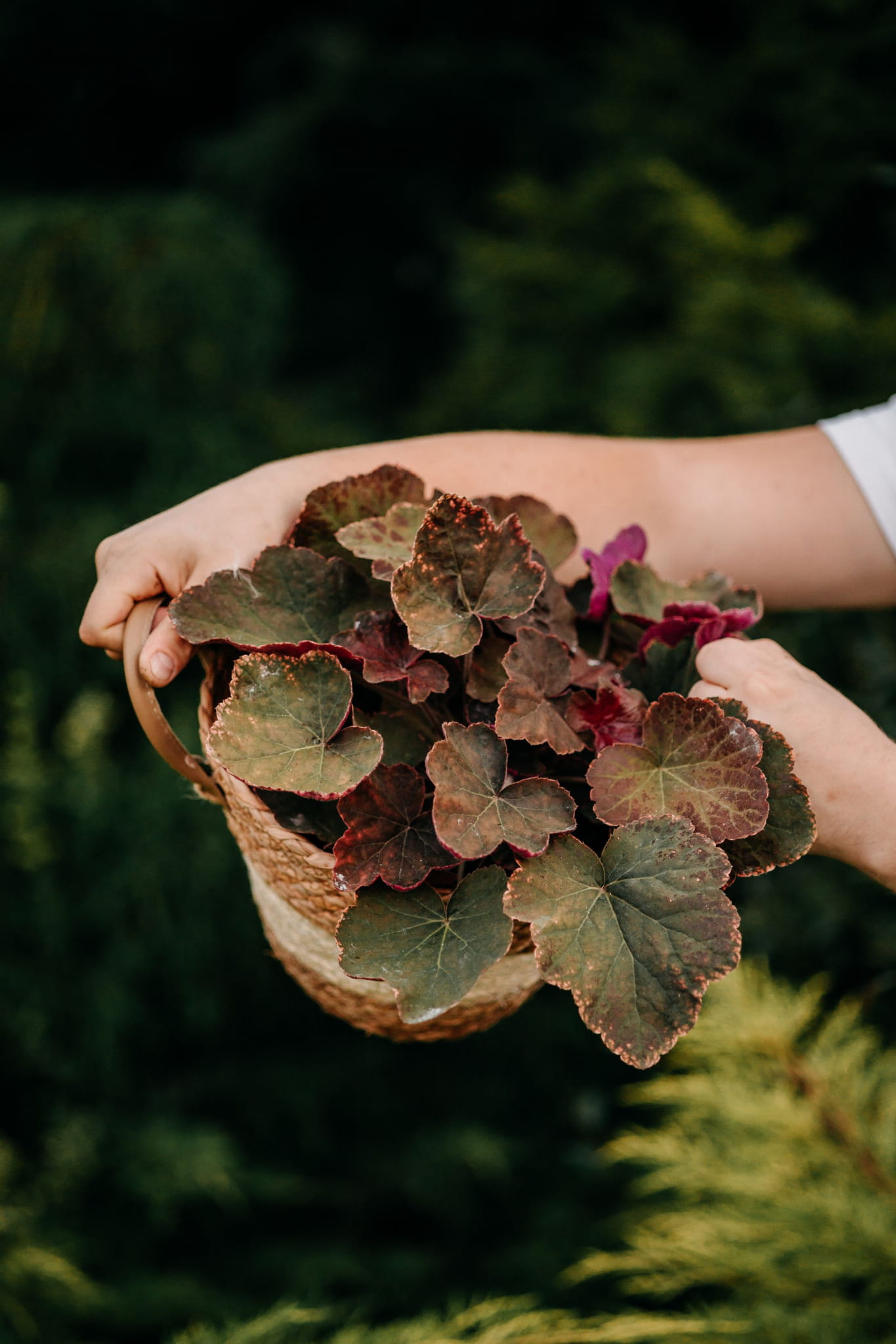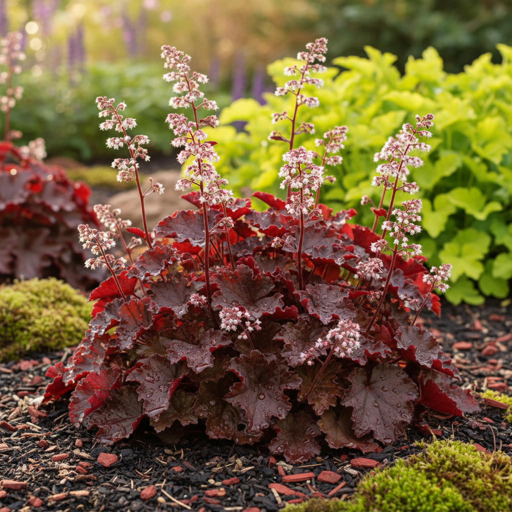 Żurawka ‘Fire Chief’ (Heuchera) to wyjątkowo dekoracyjna bylina o intensywnie czerwonych, lekko błyszczących liściach, które zachowują swój kolor przez cały sezon. Tworzy zwarte, kuliste kępy osiągające wysokość ok. 25–45 cm. Jej największym atutem jest barwa – głęboka czerwień liści z delikatnym kontrastem ciemnych nerwów prezentuje się niezwykle efektownie przez cały rok. Od wiosny aż do jesieni roślina wypuszcza drobne, jasnoróżowe kwiaty na cienkich, czerwonych łodyżkach, które delikatnie unoszą się nad liśćmi, dodając kompozycji lekkości.