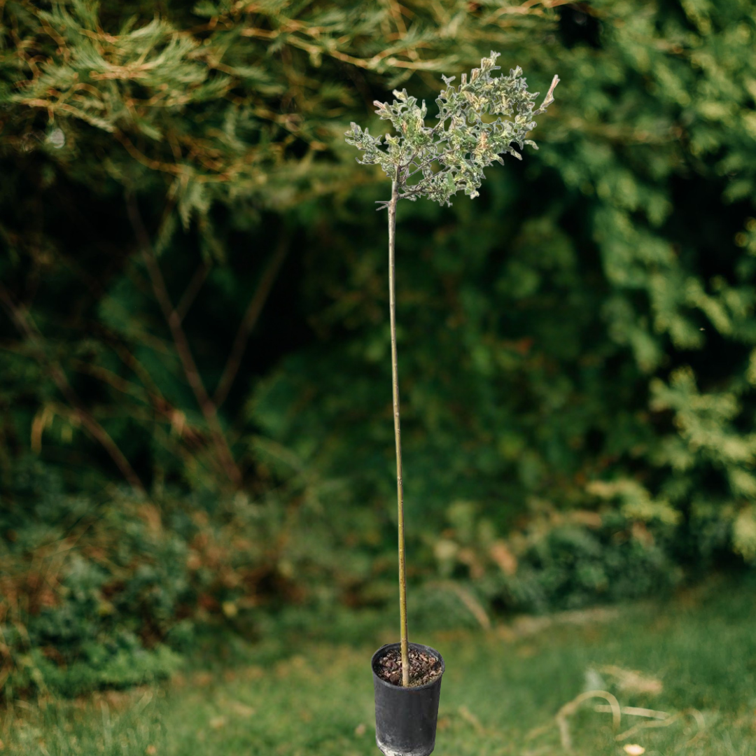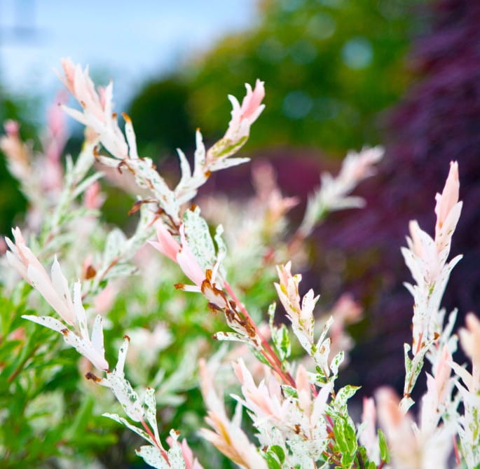 Wierzba japońska ‘Hakuro Nishiki’ szczepiona na pniu (Salix integra) to efektowna, ozdobna roślina o kolorowych liściach, tworząca dekoracyjną, kulistą koronę. Osiąga 1,5–2 m wysokości, w zależności od wysokości szczepienia. Młode liście mają unikalne, biało-różowo-zielone wybarwienie, które nadaje roślinie niezwykły, delikatny wygląd. Wiosną pojawiają się także drobne, żółtawe bazie, a latem liście stają się bardziej zielone, zachowując jasne przebarwienia. Jesienią wierzba zrzuca liście, ale jej dekoracyjne, czerwone pędy zdobią ogród również zimą. Doskonała do sadzenia w ogrodach przydomowych, w donicach na tarasach i balkonach, pojedynczo oraz w kompozycjach z innymi roślinami. Dzięki niezwykłemu wybarwieniu liści i eleganckiej, kulistej formie wierzba ‘Hakuro Nishiki’ to jedna z najpiękniejszych ozdobnych wierzb do ogrodu!