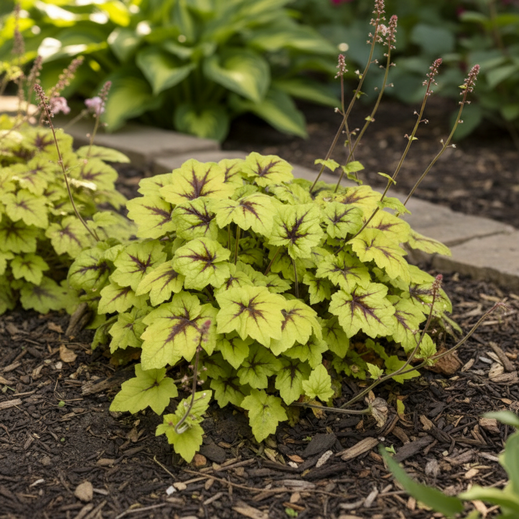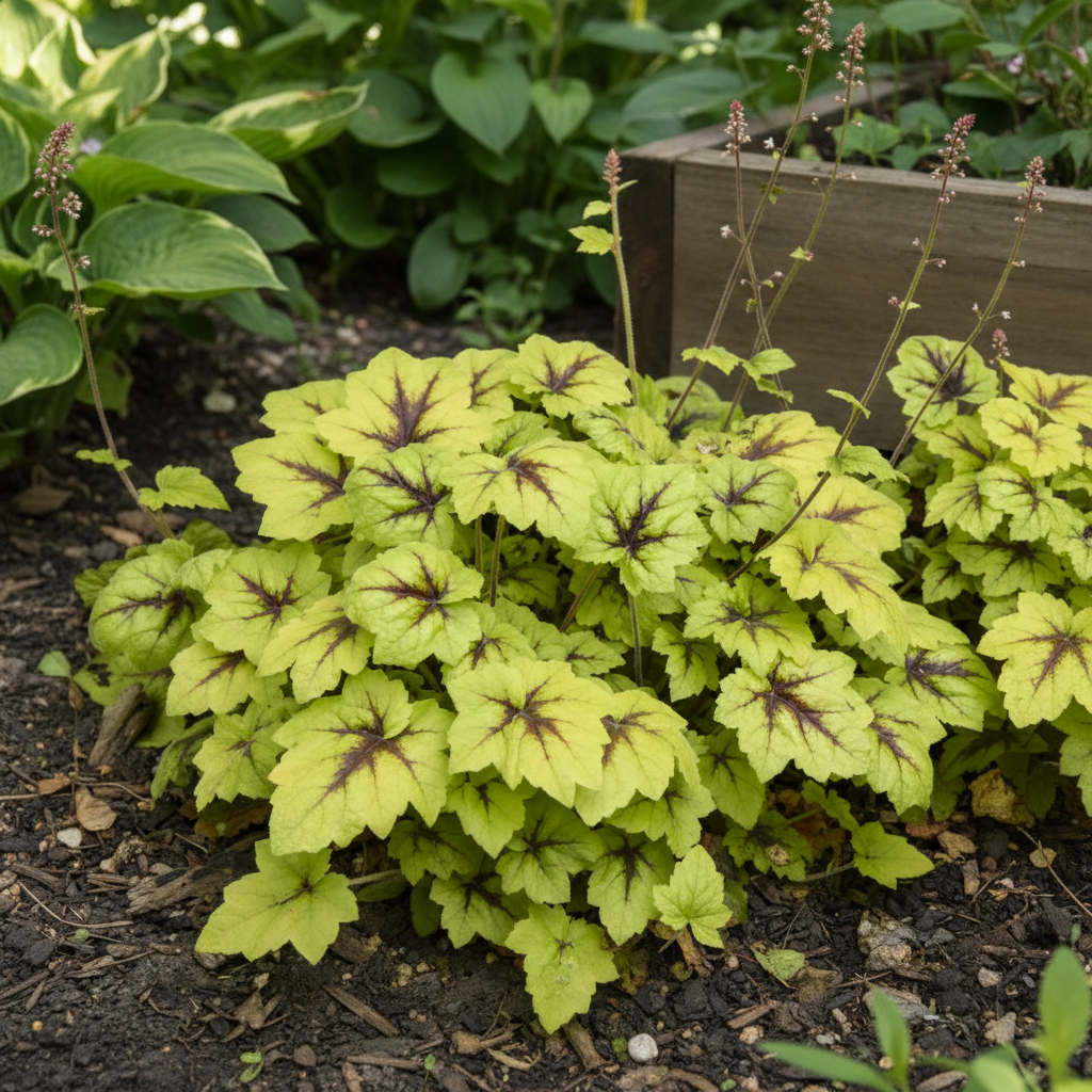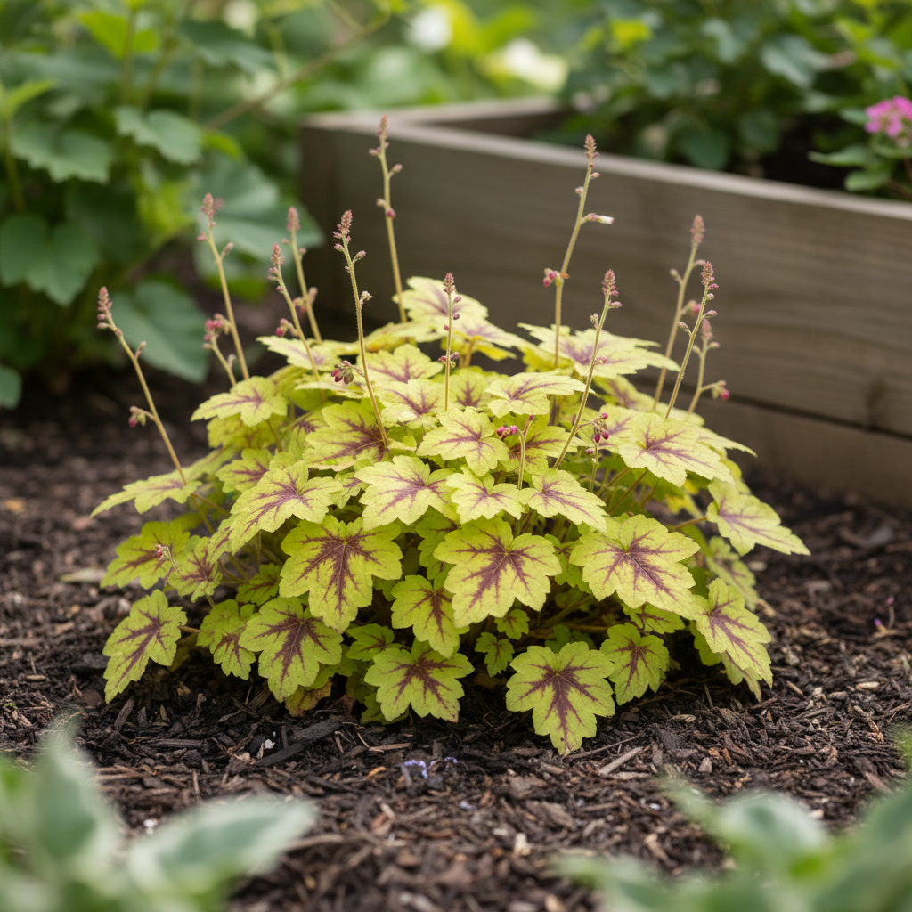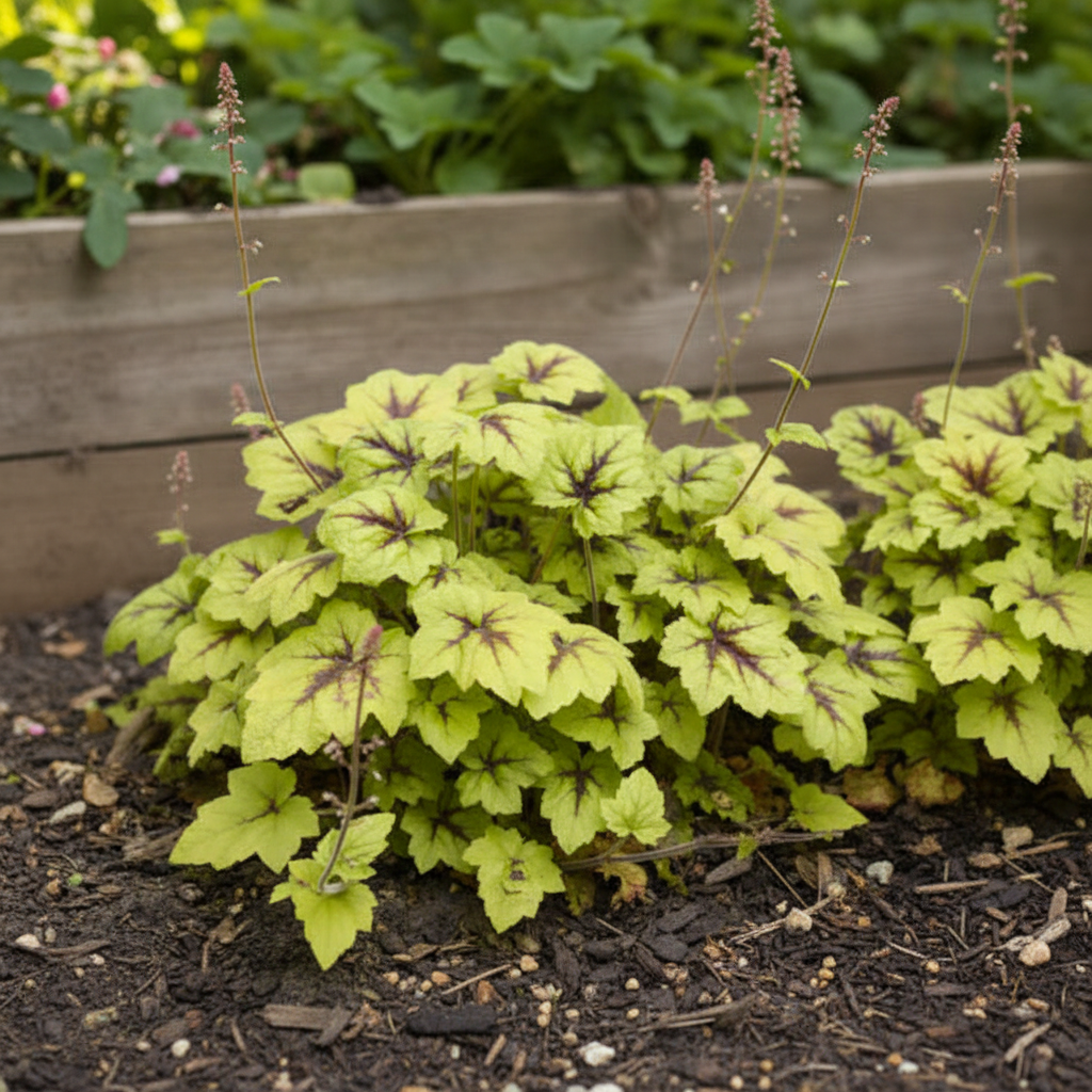 Żurawka ‘Catching Fire’ (Heuchera) to efektowna bylina ozdobna z liści, która przyciąga wzrok intensywnym wybarwieniem przez cały sezon. Jej duże, klapowane liście mają jaskrawozielony kolor z wyraźnym, ciemniejszym unerwieniem i kontrastującą, limonkowo-zieloną obwódką. Dorasta do około 25–30 cm wysokości i tworzy zwarte, półkuliste kępy, które pięknie prezentują się na rabatach, w pojemnikach i cienistych zakątkach ogrodu. ‘Catching Fire’ to odmiana, która naprawdę rozpala kompozycje – intensywne, ogniste kolory liści nie bledną nawet w półcieniu.
